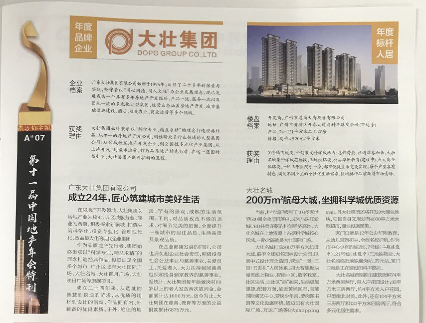 榮耀時刻!大壯集團獲2019年度品牌企業大獎,大壯名城連獲數項大獎