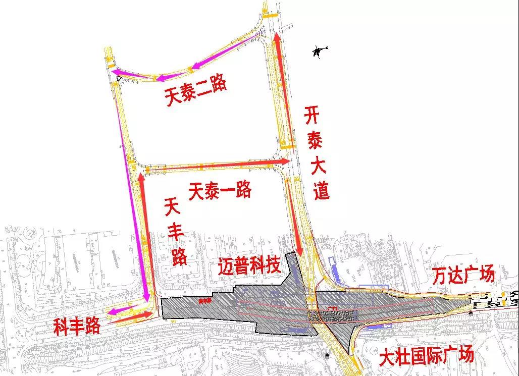 ①天泰一路改為南往北四車道單行,使科豐路進入開泰大道形成科豐路→天豐路→天泰一路→開泰大道繞行方案;