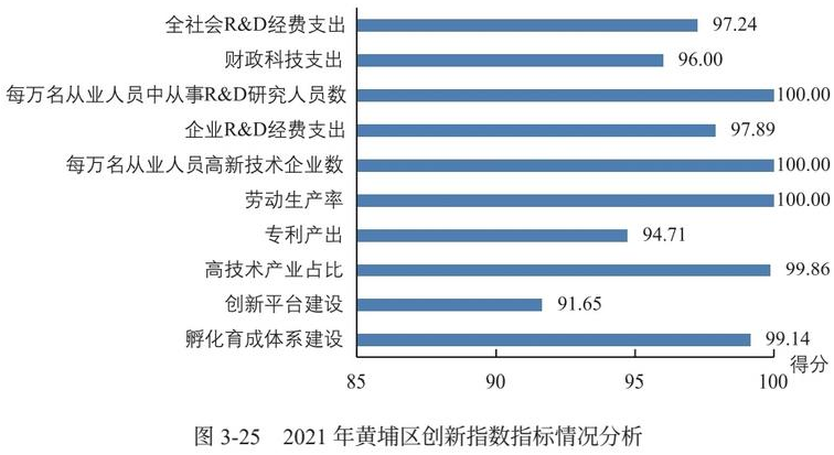 從黃埔區創新指數指標情況分析可以看到,企業創新和創新績效表現突出,每萬名從業人員高新技術企業數得分為100分,高技術產業占比得分為99.86分,指標得分排名均居全市第一。