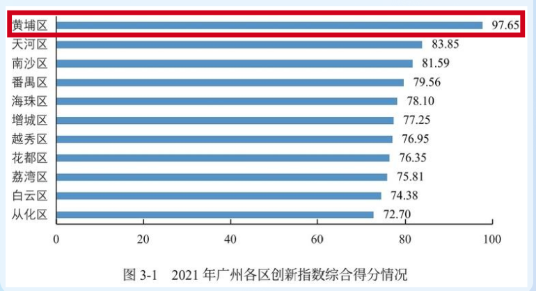 據中國科學技術發展戰略研究院、廣州生產力促進中心(廣州創新戰略研究院)、廣州市科學技術發展研究中心聯合發布的《廣州城市創新指數報告(2022)》顯示,黃埔區以優異的創新指數綜合得分再次位居全市各區首位,多項指標得分均排名全市第一。