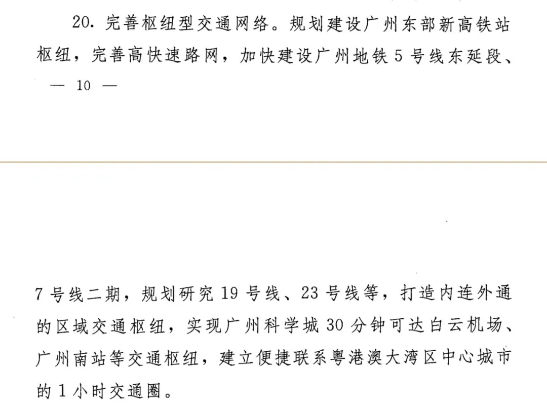 方案中提到:廣州城內加快建設廣州地鐵5號線東延段、7號線二期,規劃研究19號線、23號線等,實現廣州科學城30分鐘可達白云機場、廣州南站等交通樞紐,建立便捷聯系粵港澳大灣區中心城市的1小時交通圈。